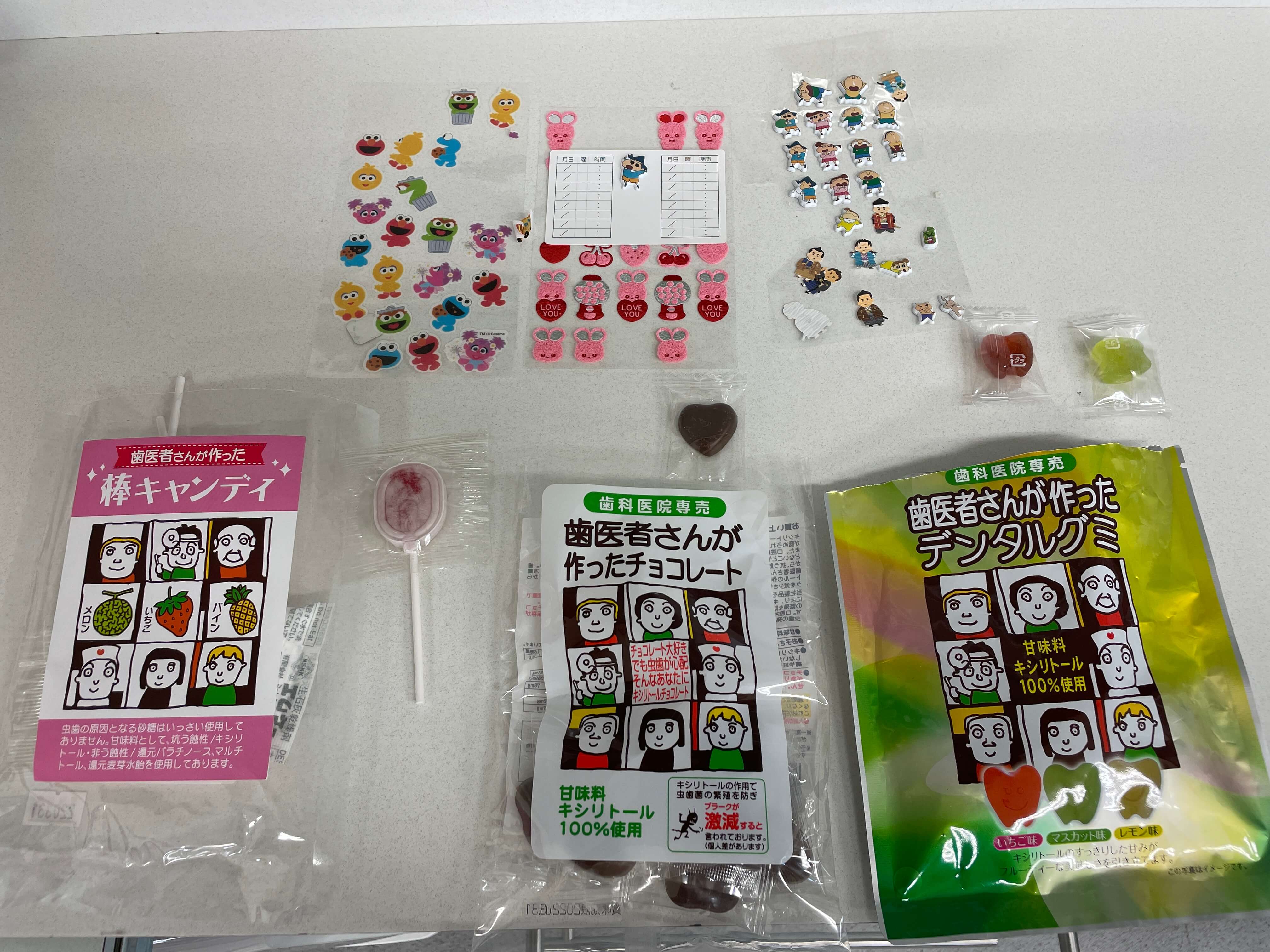 診療後にもらえる虫歯予防のお菓子と診察券に貼るシール